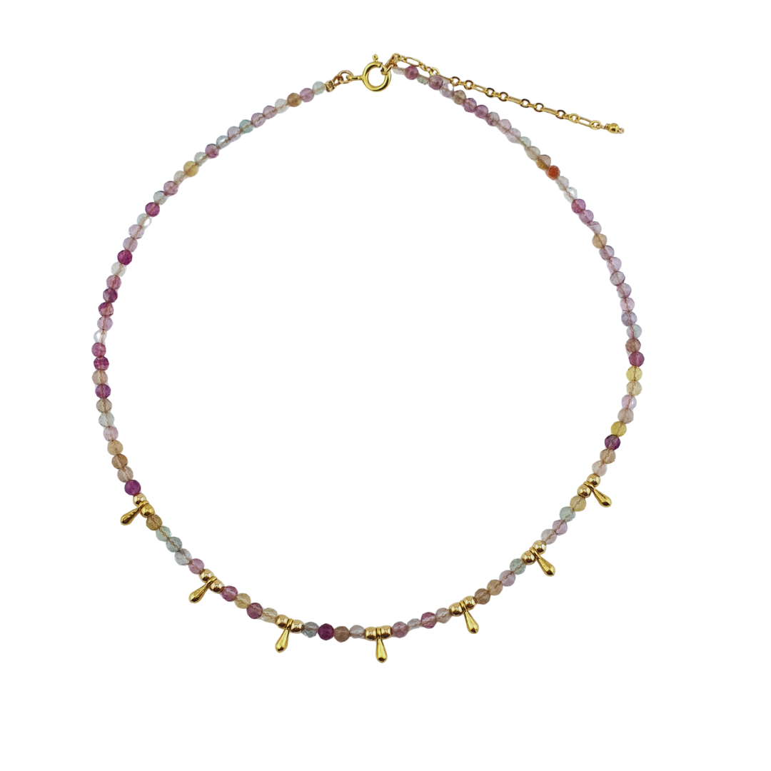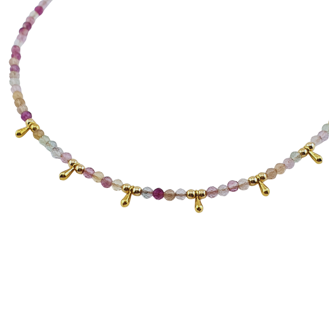 Piedras amatista y aquamarina mix con bolitas de bimetal, gotas acero chap 24k