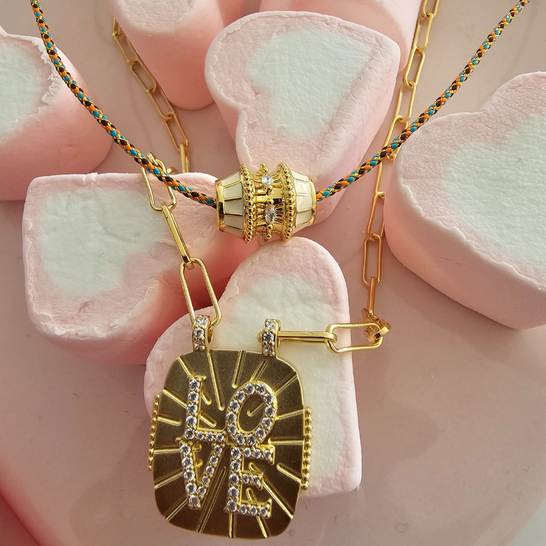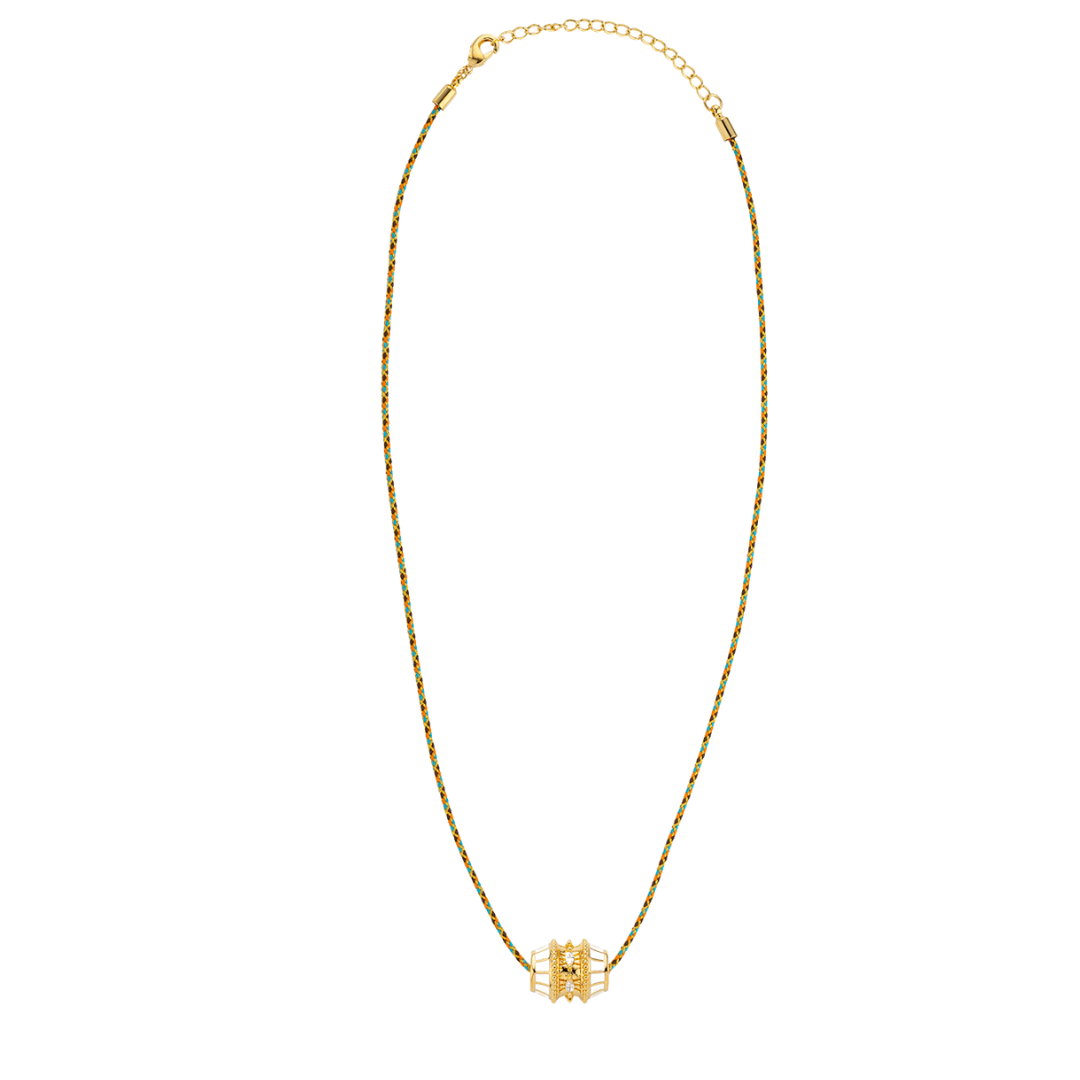 Cordón hilo de algodón y metalizados y barril en bronce chapado en 24k, con enamel en colores