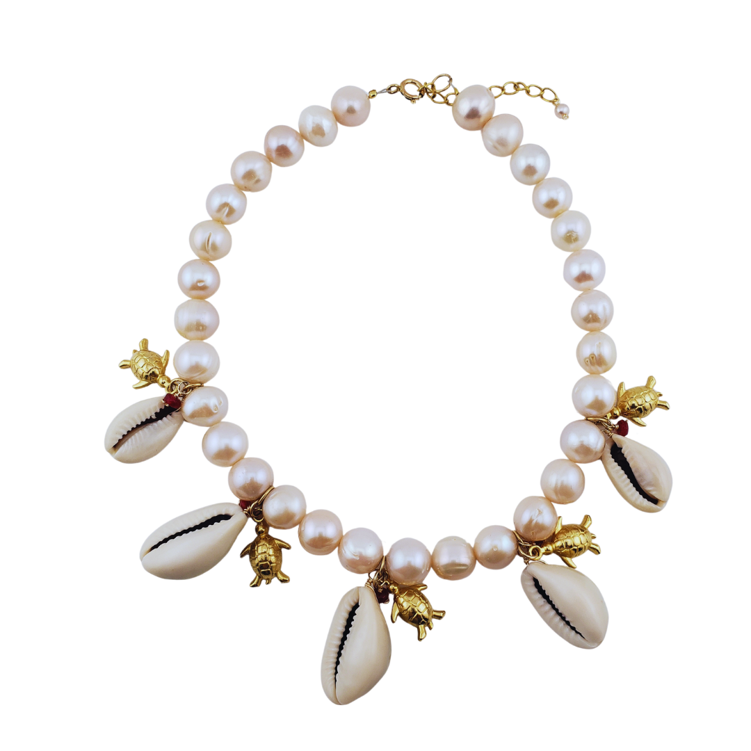 Collar perlas rosadas caracoles y tortugas